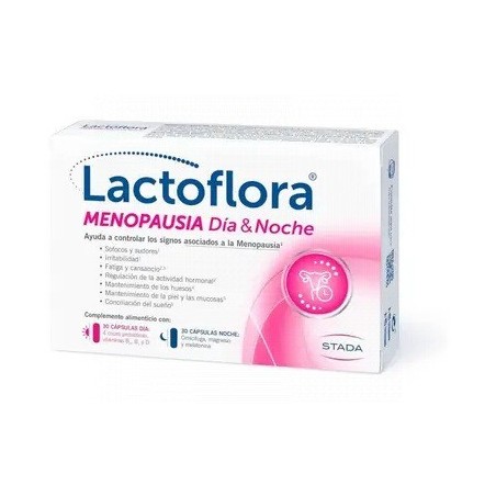 Lactoflora® menopausia día & noche es un complemento alimenticio formulado específicamente para la etapa de la menopausia y perimenopausia, aportando alivio y confort durante este periodo de cambio. Contiene una exclusiva mezcla de probióticos patentados, extractos de origen vegetal, vitaminas y minerales que ayudan a controlar los signos asociados a esta etapa. Lactoflora® menopausia día & noche está formulado en cápsulas color rosa para el día y color azul para la noche.